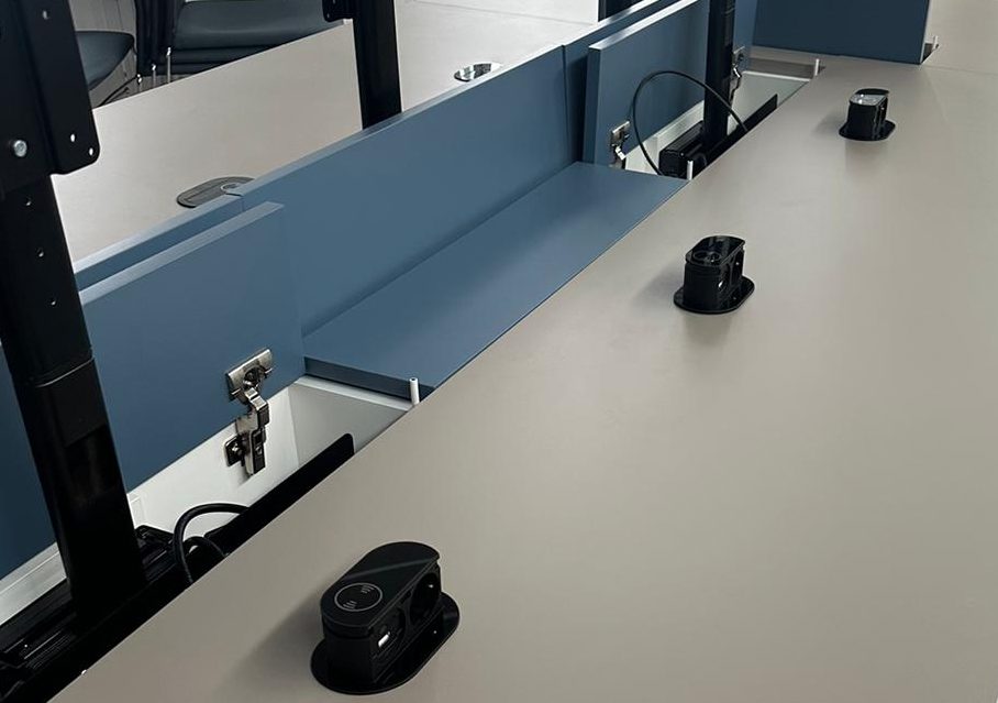 Cable management is always given particular attention in the design of our furniture. Cables run through the raised floor and are managed along the entire length of the table to ensure a flawless result.